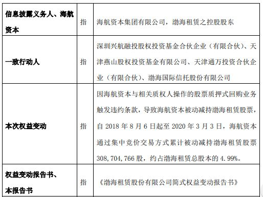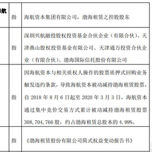 据渤海租赁5日晚间发布公告,因控股股东海航资本与相关质权人操作的股票质押式回购业务触发违约条款,导致海航资本被动减持渤海租赁股票,自2018年8月6日起至2020年3 月3日,海航资本通过集中竞价交易方式累计被动减持渤海租赁股票3.087亿股,约占渤海租赁总股本的 4.99%。