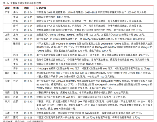 在国家推出对氢能源领域中上游发展的利好政策后,我们也可以看到随后部分省市也相继出台了一些对加氢站的补贴政策,平均而言对加氢站建设的补贴力度在 300~500 万元左右,从而可以有效对冲加氢站整体 1000 万元左右的建设成本。
