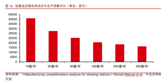 目前国内加氢站主要应用的是 PDC 公司生产的隔膜压缩机,同时中船重工 718 所通过与美国 PEC 公司技术合作组装可供加氢站使用的氢气压缩机,但核心压缩模块仍由PDC 提供,相比整机进口成本降低了约 30%。我们预计未来随着需求增加,针对不同参数压缩系统的阀组、传感器等辅助部件将趋于标准化、集成化的生产模式,预计未来压缩系统的成本具有较大的降低空间。
