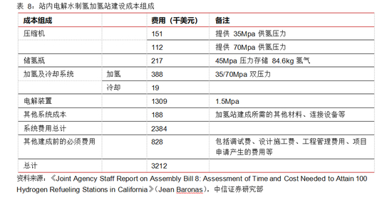 对日供氢 130kg/d、具备 35/70Mpa 两种加氢压力的站内电解水制氢加氢站而言,虽然省去了运输氢气的费用,但电解水制氢装置成本就达到 131 万美元,总建设成本超过320 万美元。