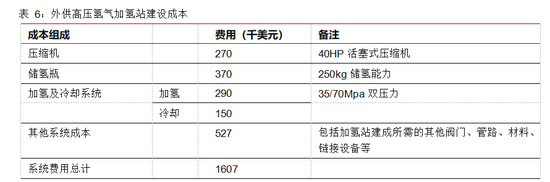 对于日供氢气能力为 180kg/d、存储能力为 250kg、同时具备 35/70Mpa 两种加氢压力的外供高压氢气加氢站为分析对象,加州能源局的研究数据表明,该类型加氢站建设成本大约为 160 万美元,再考虑到投入前使用所需的调试费、设计施工费、工程管理费用、项目申请产生的费用等,总成本将超过 200 万美元。