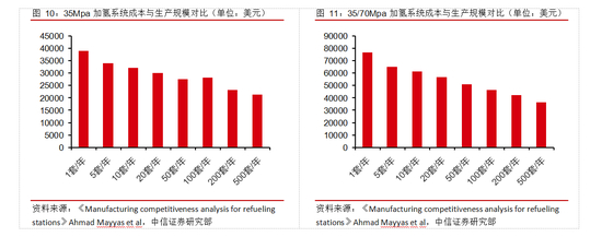 l 35/70Mpa 双加注口加氢系统总成本较 35Mpa 单加注口加氢系统成本增加约 1倍,当生产规模由 10 套/年增加到 500 套/年时,加氢系统总成本可降低 30%~35%。