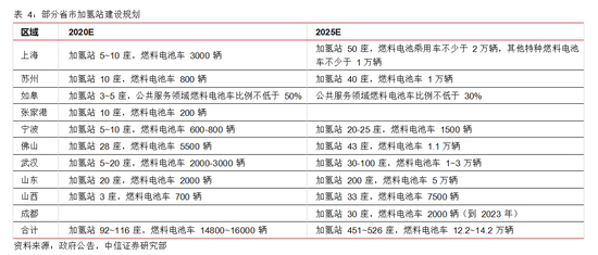 具体到对加氢站的规划而言,广东、上海、浙江等省市均对 2020 年或 2025 年的加氢站建设提出了明确的规划,目前已统计出到 2020 年建设规划加氢站 92~116 座,到 2025年建设加氢站 451~526 座,已明显高于国家整体规划的 100/300 座。