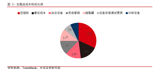 除去土地成本,加氢站中建设成本最高的主要是三大核心成本:压缩机、储氢瓶、加 氢系统,成本占比分别为 32%、14%、11%。由于国内缺乏成熟量产的加氢站设备商,进口设备成本较高也就间接推高了加氢站建设成本。
