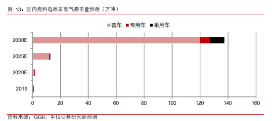 按照上述燃料电池车的数量预测,按照如下假设推算氢气耗用量:客车每年行驶 10 万 km,每百公里耗氢 6kg;专用车每年行驶 1 万 km,每百公里耗氢 3kg;乘用车每年行驶 2 万 km,每百公里耗氢 1kg。预计 2020 年国内燃料电池车氢气需求为 1.5 万吨左右,2025 年可达到 13 万吨左右,2030 年接近 140 万吨,从而预计到 2030 年加氢站行业的利润空间可达到 70 亿元左右。