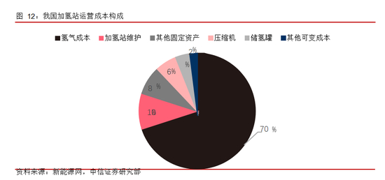 在加氢站建成投入运营后,收入端主要来自于氢气的销售,成本端主要来自于氢气的采购存储、固定资产折旧及人工等其他可变动成本,目前我国加氢站运营成本中大概 70% 来自于氢气成本。