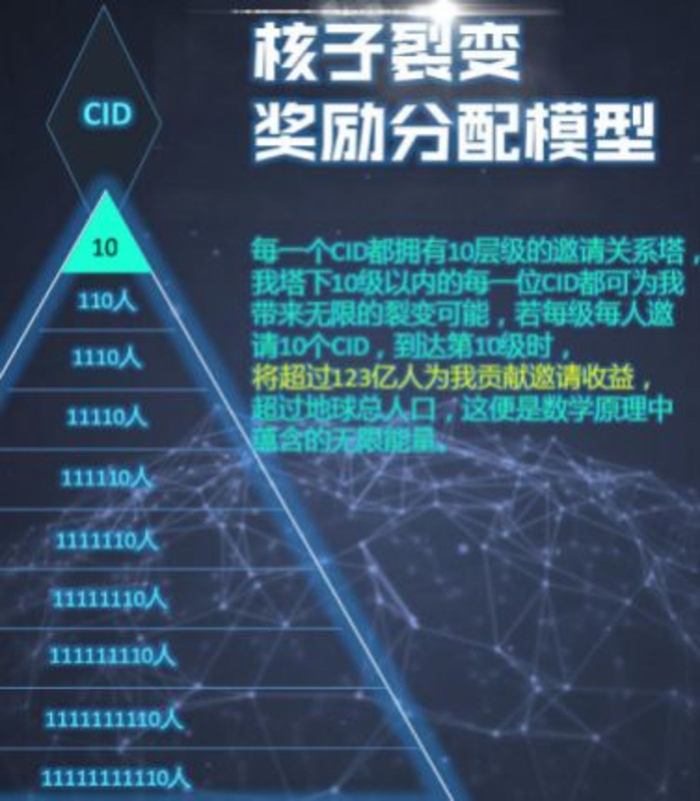 对于这一模式,CXC也给出了极具蛊惑性的文案:“若我塔下10级每级每人邀请10个CID,到达第10级时,将有超过123亿人为我贡献邀请收益,超过地球总人口。”