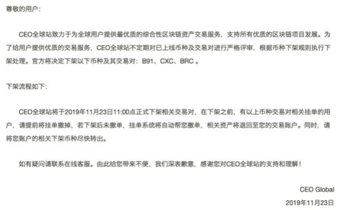 2019年11月,CEO交易所发布公告,将下架CXC
