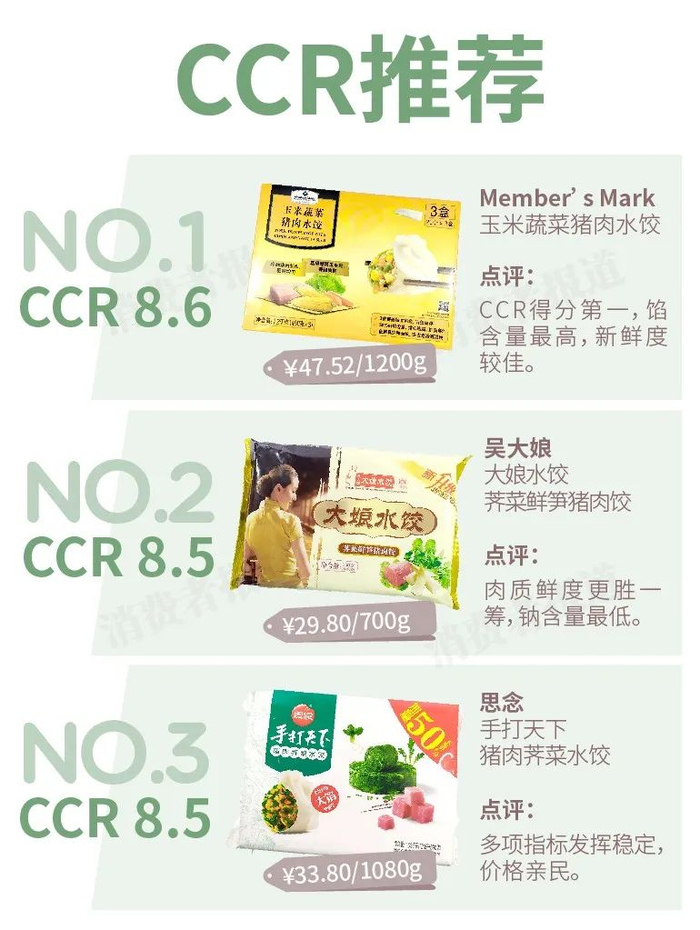 作为沃尔玛旗下山姆会员店的自有品牌“Member’s Mark”,其馅含量最高,其次是因登上《舌尖上的中国3》而名声大噪的“船歌鱼水饺”,以及国内速冻食品标杆之一的“思念”,两者馅含量略低于Member’s Mark。