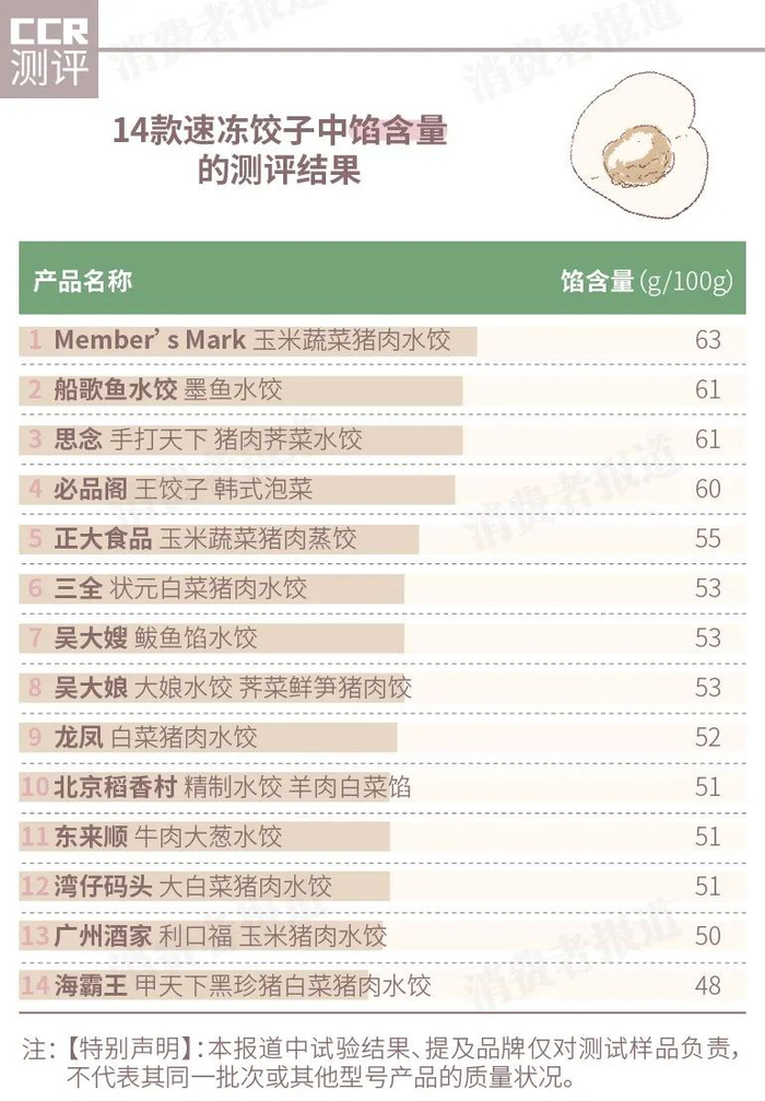 检测结果显示,14款速冻饺子的馅含量差异从48~63g/100g,全部达标。