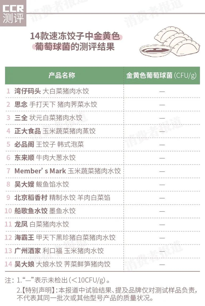 检测结果显示,14款速冻饺子均未检出金黄色葡萄球菌(<10CFU/g),说明这些速冻饺子从原料自然带入或生产、流通过程中都不存在污染金黄色葡萄球菌的风险。