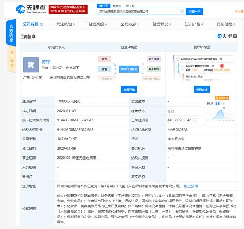 天眼查数据显示,3月9日,深圳前海启航国际供应链管理有限公司成立,注册资本为1亿元,法定代表人为黄晖,A股上市公司TCL科技集团股份有限公司为公司第一大股东,持股比例35%,TCL实业控股股份有限公司为第三大股东,持股比例23%。该公司经营范围包括供应链管理及相关配套服务、财务咨询、投资兴办实业等。