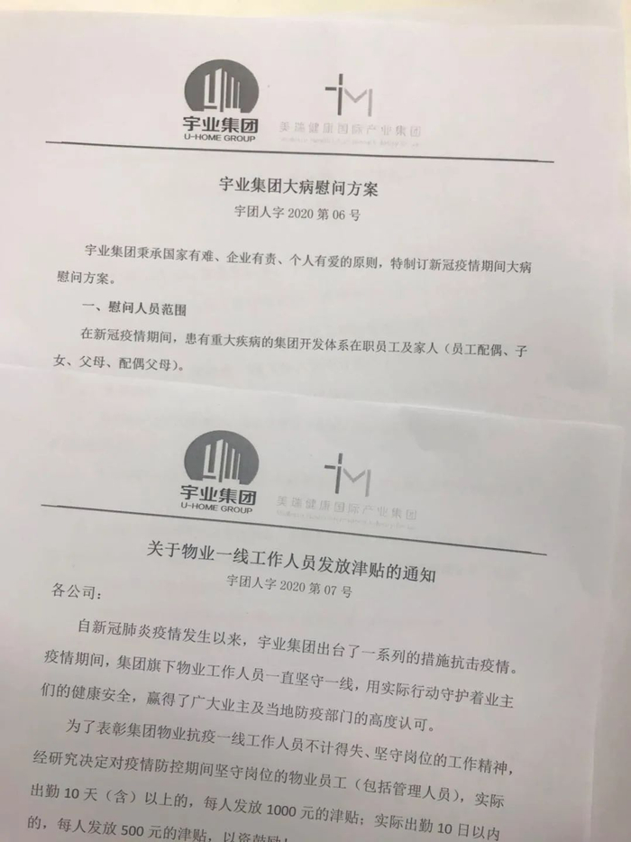 四、宇业集团向员工家庭涉疫或有大病患者发放专项补助金。并向抗疫一线所有关联社区物业人员捐发慰问金。