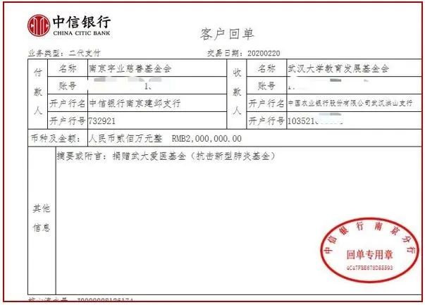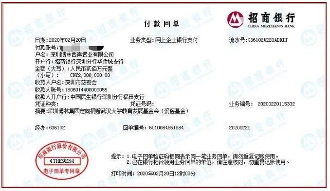 ——2月20日,发动和联合宇业战略合作伙伴深圳博林集团林友武、中珈资本CEO曾文涛校友,合计向“珞珈白衣天使爱医基金”捐赠500万元。“珞珈白衣天使基金”是由陈作涛、毛振华、喻杉、周旭洲、阎志、曾文涛、蒋锦志等18位校友发起,主要用于武汉大学附属医院一线医护人员奖励和补贴,支持学校、相关学院及医院进行疫情防治等方面研究。截止目前基金募集资金已达2500余万元。