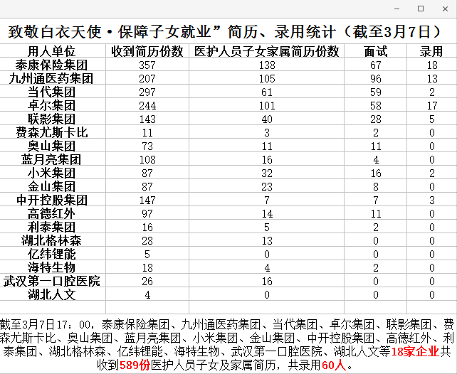 截至3月7日17时,泰康保险集团、九州通医药集团、当代集团、卓尔集团、联影集团、费森尤斯卡比、奥山集团、蓝月亮集团、小米集团、金山集团、中开控股集团、高德红外、利泰集团、湖北格林森、亿纬锂能、海特生物、武汉第一口腔医院、湖北人文等18家企业共收到589份医护人员子女及家属简历,共录用60人。