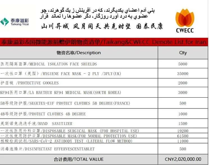 三、由理事长东升泰康溢彩公益基金会、张健校友国微能源联合捐赠给伊朗人民的防护物资,将于下周四飞抵德黑兰。
