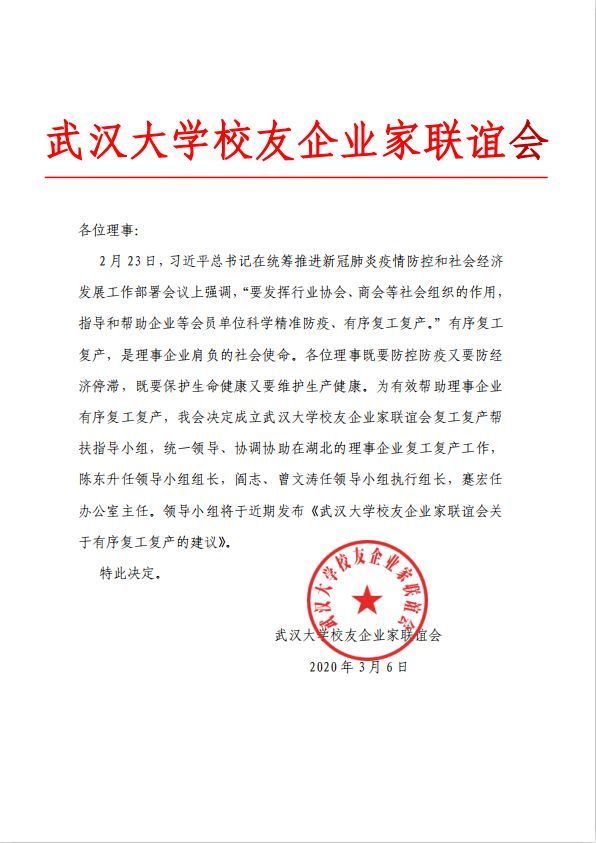 关于成立“武汉大学校友企业家联谊会复工复产帮扶指导小组”的决定