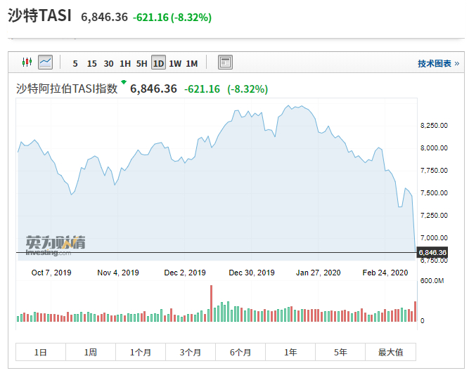 受油价和疫情影响,中东股市出现本周开盘出现暴跌走势。全球最大的石油巨头,沙特阿美公司股价本周首次跌破原始发行价。市值跌幅超过1万亿元人民币。
