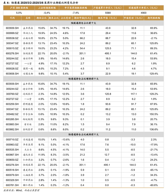 医药陆股通持仓前五分别为:益丰药房、华润三九、云南白药、泰格医药、爱尔眼科;