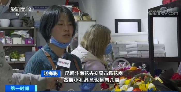 昆明斗南花卉交易市场花商 赵梅聪:花束今天卖了100多束,花篮也卖了100多盆,小的礼品盒也有几百个。跟去年相比差不多减少了1/3。
