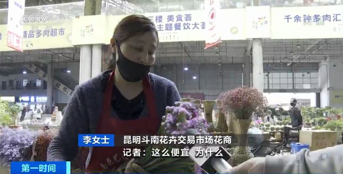 昆明斗南花卉交易市场花商 李女士:原来我们卖10元、15元,现在是卖5元、6元。记者:为什么?