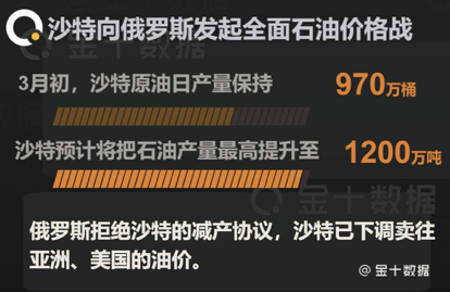 此次油价暴跌,源于OPEC(石油输出国组织)与俄罗斯的减产谈判破裂。上周五(3月6日),双方未能就减产150万桶/日原油产量的协议达成一致。随后,沙特打响了原油价格战,并宣布增产至逾1000万桶/日、大幅降低售往欧美等海外市场的原油价格,以抢夺俄方市场。