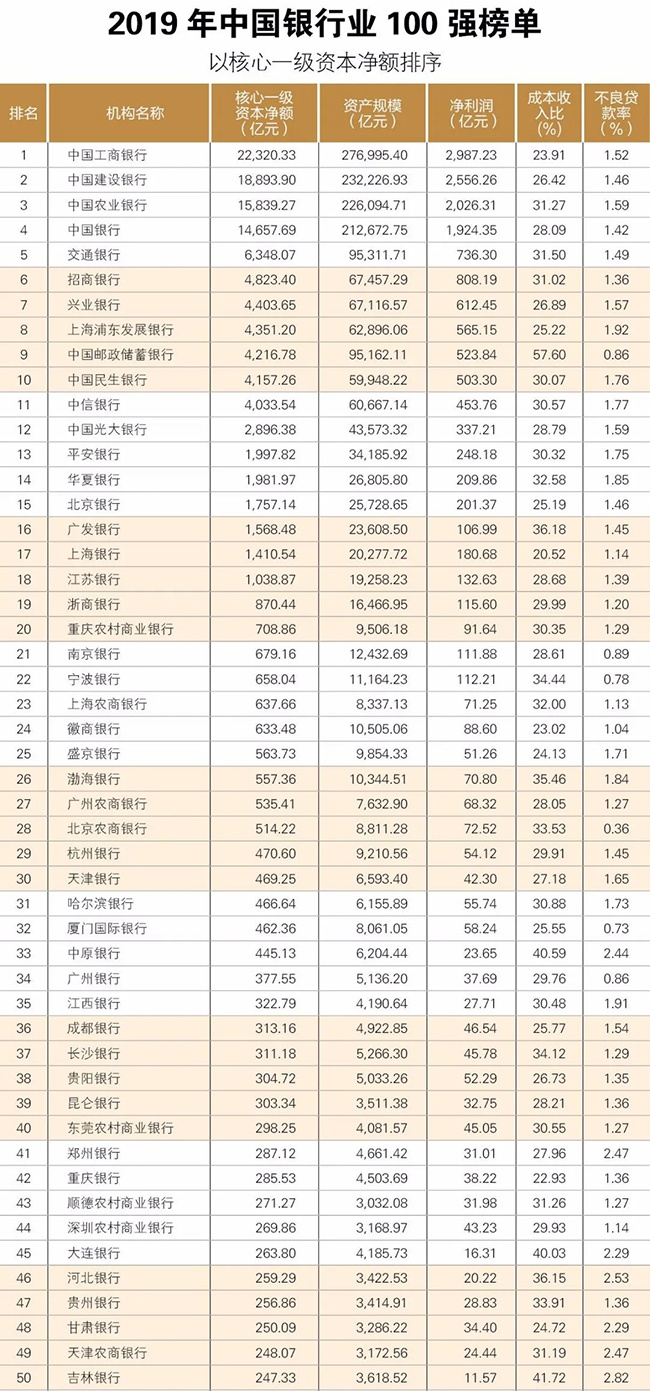 中国银行业协会发布“2019年中国银行业100强榜单”