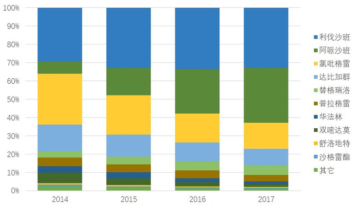 根据药物综合数据库(PDB),在全球上市的口服抗凝药中,主要被格雷类和沙班类盘踞。自2014年开始,氯吡格雷市场份额持续走低,而沙班类逐渐占据主导地位。