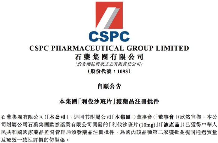 今天,石药集团发布公告称,其附属公司石药集团欧意药业有限公司开发的利伐沙班片(10mg)已获得国家药监局发发的药品注册批件,为国内该药品第二家获批并视同通过一致性评价的仿制药。