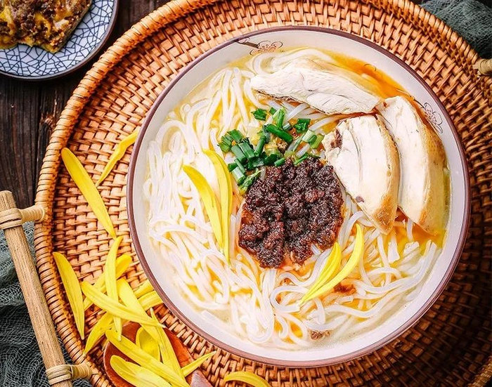 某天因事耽搁,妻子急中生智用鸡油烫米线,恰好陶土器皿传热不好,便把热量封存在汤内。
