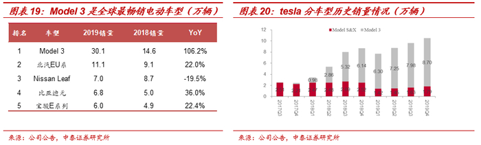 特斯拉Model3显著放量,市场认可度凸显,是全球最为畅销车型。2017年7月Model 3正式于Fremont的广场交付,但是随后因电池产线自动化等问题,导致Model 3产能释放不及预期,周产量也未迟迟未有明显提升,2018年5月之前,周产量为3000辆以下;但2018年5月后,随着电池产线问题得到解决,周产量得到迅速提升,2018年 6月底达到5000辆。因此,进入到2018Q3,特斯拉Model 3销量得到显著提升,单季度销量达到约5.3万辆,而截至2019Q4,Model3单季度销量已经提升到9.26万辆;另外,从各品牌车型2019年销量来看,Model 3销量远超其他品牌电动车型。