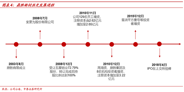 公司前身为镇江鼎胜铝业有限公司,成立于2003年8月;2008年7月,鼎胜有限变更为股份有限公司,2015年12月,公司名称变更为鼎胜新材,2018年公司首次公开发行6500万股股票并在上交所挂牌上市。截至2018年底,鼎胜集团持股32.26%,为公司控股股东;周贤海、王小丽通过鼎胜集团间接持有公司32.26%的股份,并分别直接持有公司11.26%和1.53%股份,合计持有公司45.05%的股份,为公司实际控制人。