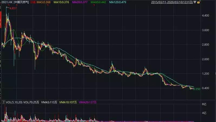 股价而言,中国天然气是一只仙股。截至今天收盘,下跌1.39%报0.335港元/股,最新总市值20.04亿港元。拉长时间线来看,公司转型后,股价呈一路下滑态势,与2015年4月4.857港元/股的高点相比,近五年时间已经跌去93.1%。
