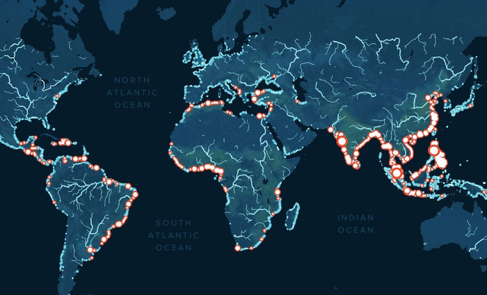 为此,他们还设计了一个利用人工智能监控计算河流中漂浮的塑料垃圾流量的装置。Slat 的团队在全世界进行了测量,并绘制了全球河流塑料垃圾吞吐量的地图。他们通过研究发现,全世界的一千条河流,也就是1%的河流贡献了80%的海洋塑料垃圾。