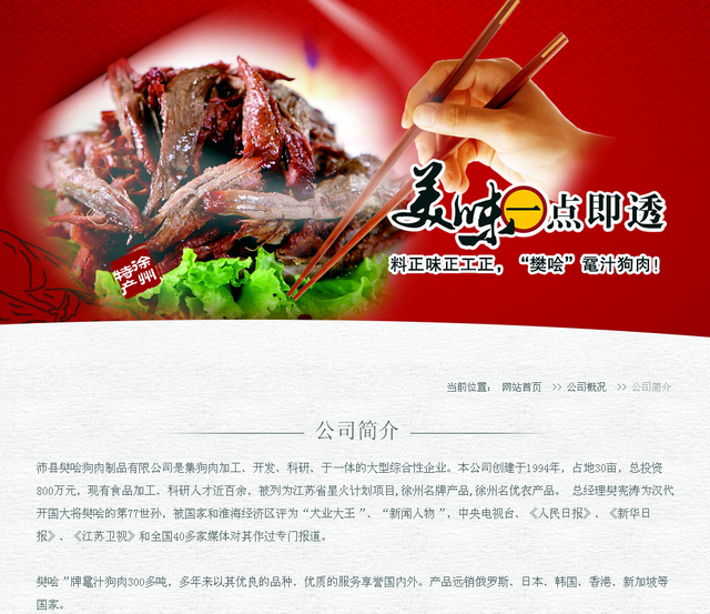 第一财经记者登陆沛县樊哙狗肉制品有限公司企业网站看到,网站首页、企业简介、品牌文化等页面和栏目中均有“鼋汁狗肉”的文字和图片。在该企业品牌文化页面,还专门介绍了“鼋汁狗肉”的由来,大意是: