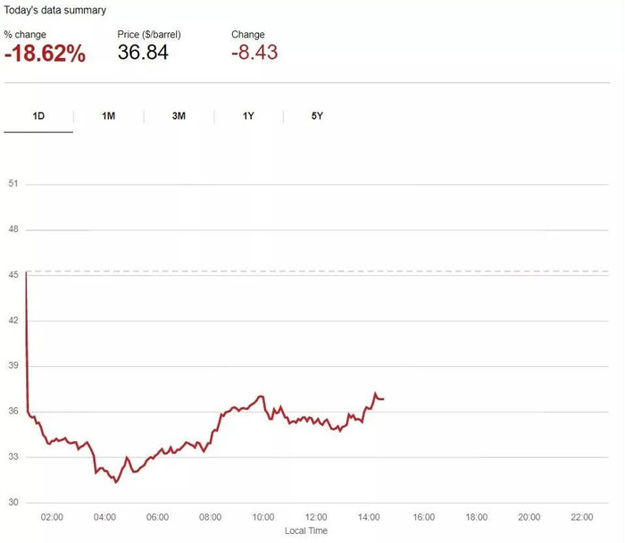 周一开盘,布伦特原油期货的价格从单桶45.27美元暴跌至31美元,盘中跌幅超过31%,刷新1991年海湾战争以来的日内跌幅纪录(图自:BBC,截至3月9日23:00)