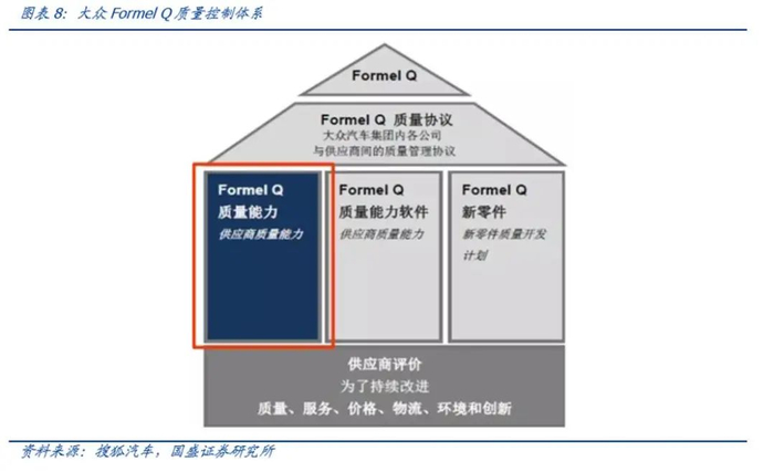 汽车电子的玻璃、触控、贴合、金属及组装与消费电子产品相比品质要求更为严苛,资格认证与审核,一直是国内供应商进入合资供应链最重要的门槛。以大众Formel Q为例,Formel Q是大众集团与其供应商建立共同合作的基础准则,其由三个模块组成:1)质量管理协议,也是大众Formel Q管理体系的总协议;2)供应商质量能力评价准则;3)新零件的质量开发计划QPN(包括两日生产验收)。