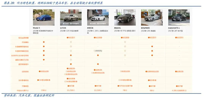 作为特色配置, Model 3在自动驾驶方面优势明显,不排除在上市之初,购车主力来自非竞品车阶层。特斯拉最新的Autopilot自动驾驶系统,搭载AutoPilot HW3.0处理芯片,并标配8枚摄像头:分为三颗前三目摄像头(长焦、标准、鱼眼)、两颗B柱摄像头、两颗翼子板后视摄像头、一颗后视摄像头。12枚的超声波雷达,1颗毫米波雷达。凭借在自动驾驶方面的持续创新,Model 3相较于传统豪华品牌的竞品车型,在自动驾驶配置方面有优势明显,加上电动车型在动力以及操控性能方面的优势,未来入门级豪华车市场预计竞争明显。