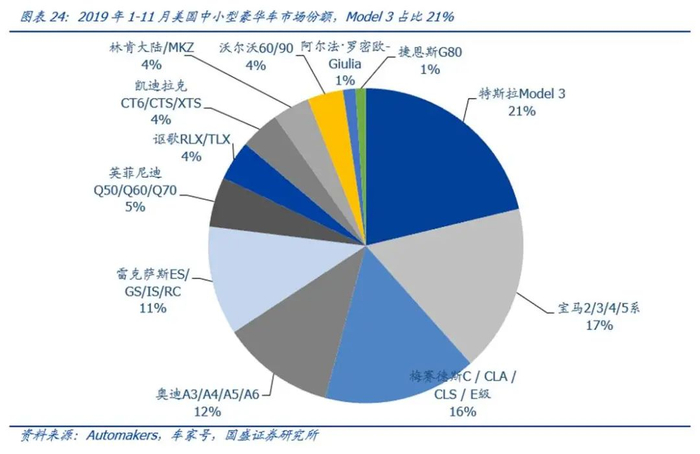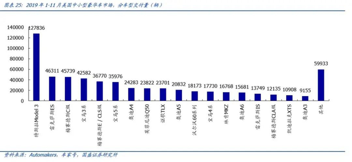 目前在美国市场,特斯拉 Model 3 已经挤占中小型豪华车21%的市场份额,作为超过BBA爆款车型,市占率进一步提升的难度较大。根据Automakers以及车家号的报道,2019年1-11月的美国交付数据中,Model 3实现交付12.78万辆,在中小型豪华车市场的占有率已经达到21%,其销量超过宝马2系、3系、4系、5系之和(市占率17%),奔驰C级、CLA、CLS、E-class之和(市占率16%),以及奥迪A3、A4、A5、A6之和(市占率12%)。