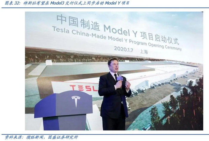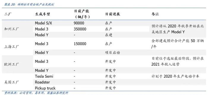 ·上海工厂一期投产15万辆M3产能,全部规划产能合计50万辆:特斯拉上海超级工厂项目总投资达500亿元,系上海有史以来最大的外资制造业项目,于2018年7月签约,并在2019年1月正式开工建设。10月17日,上海工厂获工信部《道路机动车辆生产企业及产品公告》(第325批)公示,一期投产产能15万辆/年,全部建成运营后年产能将达50万辆纯电动整车。目前生产车型为Model 3。