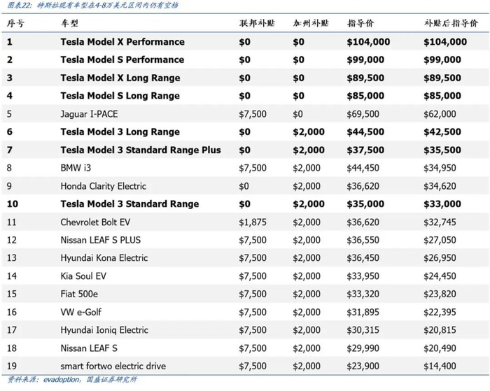 以北美版为例,特斯拉现有车型在4-8万美元区间内仍有空档。根据evadoption 基于2019年12月3日最新修订的加州CVRP(清洁车辆补贴项目)项目清单所做的统计,目前美国主流的新能源车型约45款(19款纯电车型,25款插混车型),其中享受联邦补贴或加州CVRP补贴的新能源车型共37款(12款纯电车型,25款插混车型)。同时考虑联邦与加州补贴的话,特斯拉Model 3补贴后售价约3.3-4.25万美元,其上为ModelS(补贴后售价8.5-9.9万美元)以及Model X(8.9-10.4万美元),公司现有车型在4-8万美元区间内仍有空档。