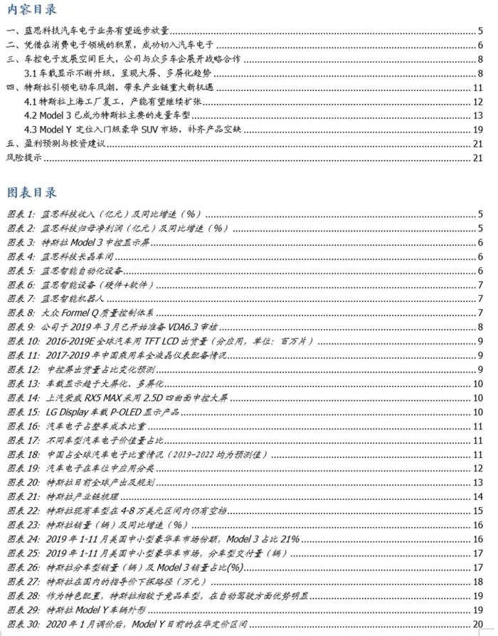 蓝思科技汽车电子业务有望逐步放量。在消费电子行业积累的技术、管理、设备与品牌,为公司汽车电子业务带来了包含特斯拉等稳定的长期高端客户。根据公司公告,在消费电子行业长期积累的综合实力与口碑,为公司吸引了诸多知名汽车品牌客户,公司已与包括特斯拉在内的众多国际中高端汽车品牌厂商和高端新能源汽车厂商建立了长期、稳定的战略合作关系,是全球知名新能源汽车品牌厂商的全球供应链主要核心一级供应商。公司以先进的技术创新、深厚的工艺研发、高效前沿的自动化设备自主研制、专业的AI大数据管理、稳定的规模化量产和持续提升的精益管理等优势,赢得客户们的深厚信任,公司已成为特斯拉全球一级核心供应商超过一年,随着model Y车型的启动,在model3等多款畅销车型的中控屏与外观功能件的玻璃、触控、贴合及整件组装等业务的大份额订单的持续落地,公司有望继续维持较大的市场份额,进一步打开上升空间。
