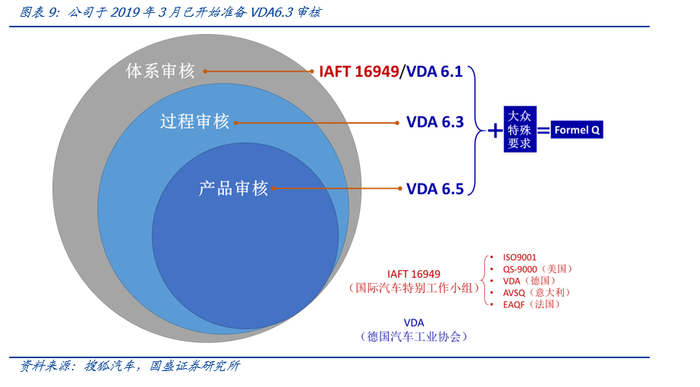 而对于大众集团为代表的跨国车企,其质量控制审核体系包括三个层面:1)体系审核:主要的审核标准为IAFT 16949以及VDA 6.1;2)过程审核:主要的审核标准为VDA 6.3;3)产品审核:主要审核标准为VDA 6.5。
