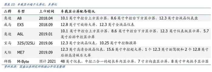 技术升级推动车载显示功能集成不断丰富,屏幕配备数量上升,多屏化趋势渐显。目前除了仪表盘、中控屏、HUD外,还有内/侧后视镜屏、吸顶屏、后座娱乐屏、后座扶手屏、旋钮屏等等应用了车载显示技术,车载显示想象空间逐步拓宽。如2019年奥迪推出的A6L,配备了多达4块全界面显示屏:10.1英寸中控台上方显示器、8.6英寸中控台下方显示器、12.3英寸仪表板显示屏、5.7英寸后排中控显示屏。拜腾预计于2021年正式推向市场的M-Byte在搭载48英寸超长车内显示屏的同时,还搭载了尺寸分别为7英寸和8英寸的方向盘显示屏及中央扶手显示器。