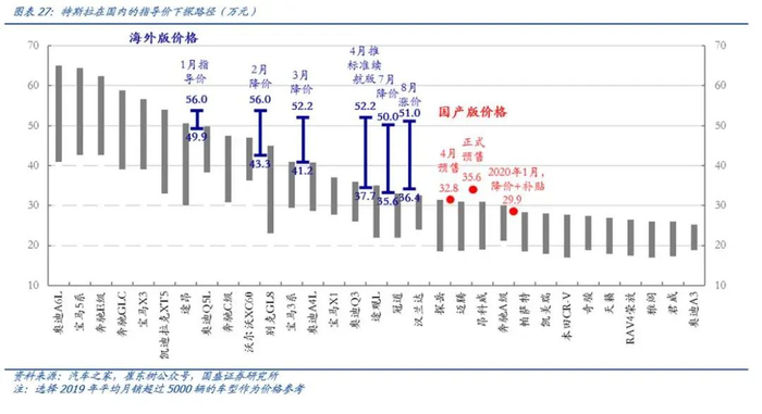 ·7月:海外版普降2.11-3.31万元。2019年7月,特斯拉海外版车型普降,其中Model 3标准续航升级版起售价从37.7万元降至35.59万元;长续航全轮驱动版从46.3万元降至42.99万元;高性能版从52.2万元降至49.99万元。