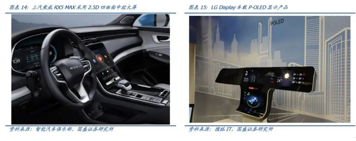 柔性显示技术的不断发展为汽车显示创新提供新空间,多形态化提升科技感和用车体验。为应对用户对车内装饰美感、科技感的追求,一体化、曲面、异形、超长显示屏设计也渐渐成为车企设计的新关注点,异性屏、柔性屏和透明打开个性化设计的空间。2019年推出的上汽荣威RX5 MAX搭载了一块14.3英寸的曲面中控屏,曲面整体化设计使得整车呈现出更强的未来科技感。另外在对显示屏表面进行AG防眩光等处理后,曲面显示角度设计能够为驾驶者提供更舒适的视野,提升用车体验。