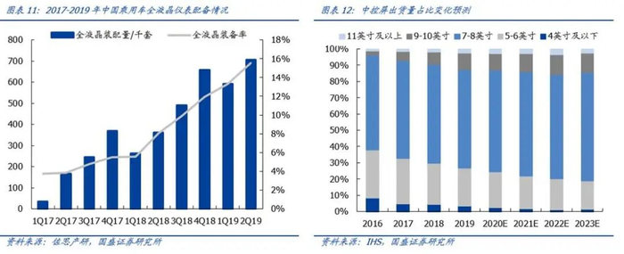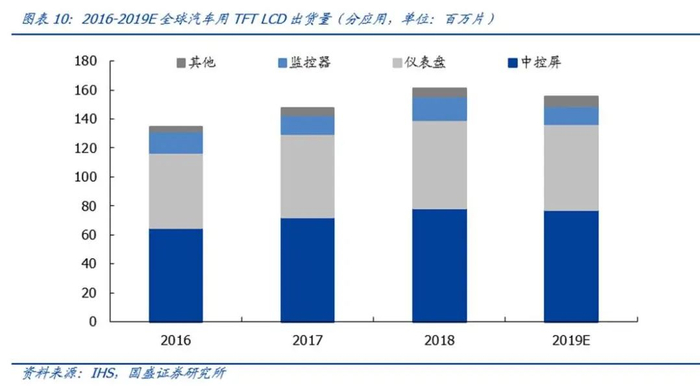 汽车显示中,中控屏及仪表盘应用占比最高,合计占比超80%。车载显示呈现日益多元化趋势,目前仪表盘、中控屏仍为主要应用领域,后视镜、侧边后视镜、HUD抬头显示、后座娱乐及商用显示等的应用则正在兴起,未来将更加符合用户智能化需求。根据IHS统计,2018年全球汽车汽车用TFT LCD出货量占比最高的是中控屏,出货量约为0.8亿片,占总出货量比重达48%,同比增长7.9%,仪表盘紧随其后出货量约0.6亿片,约占总出货量38%的比重,同比增长5.6%,二者合计占比达约86%。