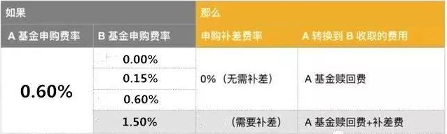 如果基金A的申购费率<基金B的申购费率,那么得补充其中差额。