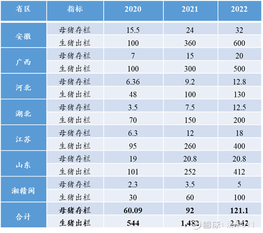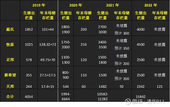 我们先来看看几家主要的生猪养殖上市公司2019年的全年生猪出栏量和年末母猪存栏量,以及他们在2020年2022年的产能规划和目标: