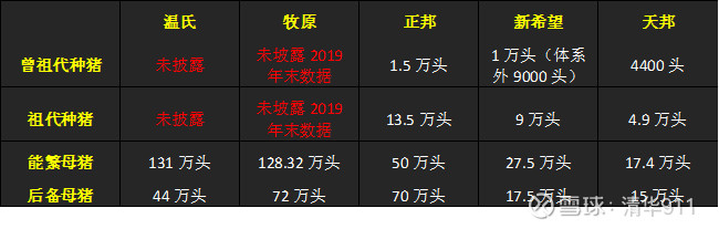 注:本人未搜集到温氏股份和牧原股份截止2019年末的曾祖代和祖代种猪数据,欢迎知情者提供或补充这项数据,拜谢!